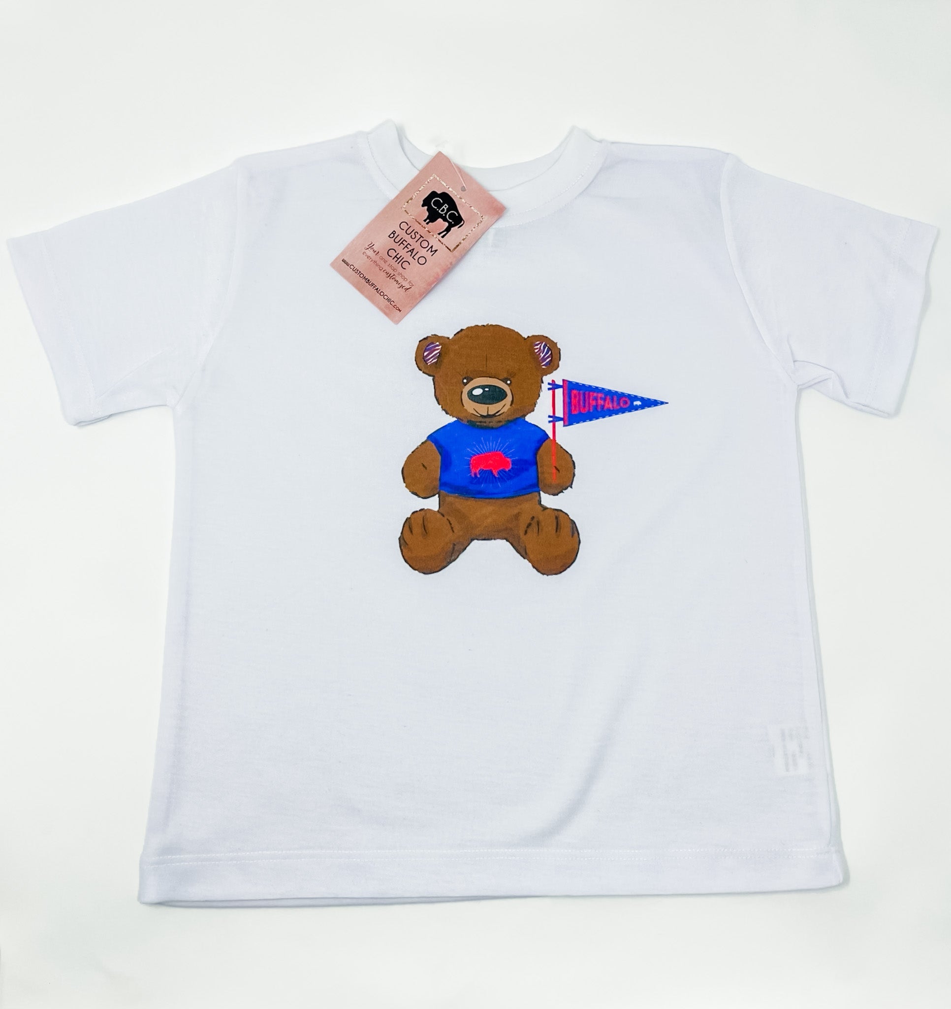 We can BEAR-LY handle the cuteness of these little Billy the Bear Buffalo Raglan Shirt! 100 % polyester super soft 3/4 length raglan shirt with red sleeves.